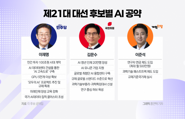 김문수 국민의힘 후보도 AI 기술의 중요성에 대해 수차례 강조했다. 인공지능(AI)·반도체 혁신 펀드, 대통령 직속 반도체 컨트롤 타워 설치 등 구체적인 공약도 내걸었다. 궁극적으로 우리나라를 AI·에너지 3대 강국으로 키우겠다고 약속했다.