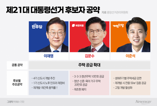 김문수 국민의힘 후보는 청년 문제 해결을 위한 주택 공급 확대와 규제 완화를 약속했다. 세부적으로 보면 결혼 시 3년, 첫 아이 3년, 둘째 아이 3년 등 단계별로 총 9년간 주거비를 지원하는'3·3·3 청년주택'을 매년 10만가구 공급한다는 계획이다. 청년·신혼·육아 가구 대상 주택을 연간 20만가구 공급하고, 1인 가구를 위한 아파트·오피스텔 공급 확대하는 방안도 포함됐다.