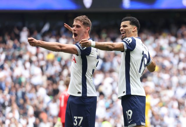 epa12134269 Dominic Solanke of Tottenham (R) reacts with team-mate Micky van de Ven after he scores the 1-0 goal from the penalty spot during the English Premier League match between Tottenham Hotspur vs Brighton & Hove Albion in London, Britain, 25 May 2025. EPA/NEIL HALL EDITORIAL USE ONLY. No use with unauthorized audio, video, data, fixture lists, club/league logos, 'live' services or NFTs. Online in-match use limited to 120 images, no video emulation. No use in betting, games or single club/league/player publications./2025-05-26 00:34:39/
