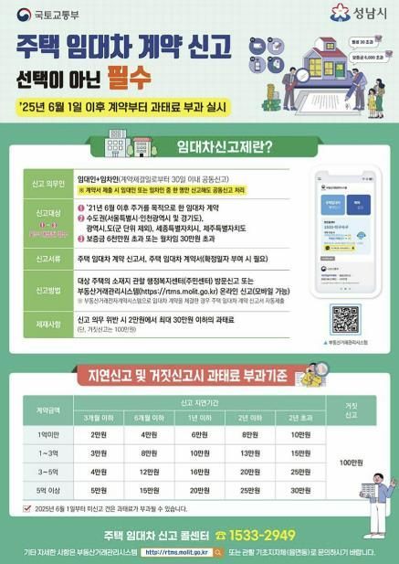 성남시 관계자는 “신규 계약뿐만 아니라 임대료 증감이 있는 갱신, 계약 조건 변경, 해제 계약도 모두 신고 대상이지만, 자동 갱신 계약과 혼동하여 신고를 누락하는 사례가 종종 발생하고 있다”며, “모든 임대차 계약 체결 후에는 반드시 30일 이내 신고를 완료해 주시기 바란다”고 당부했다.