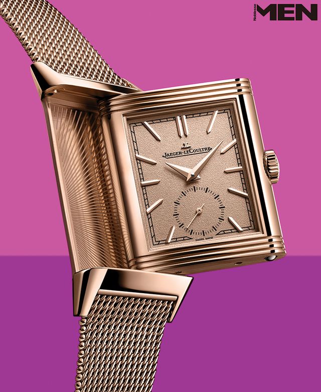 18K 핑크 골드 밀라네즈 브레이슬릿과 케이스의 리베르소 트리뷰트 모노페이스 스몰 세컨즈. 칼리버 822를 탑재했고 42시간 파워리저브가 가능하다. Jaeger-LeCoultre.