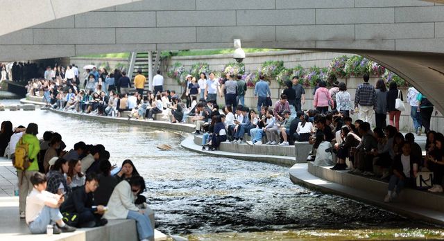 서울 청계천에서 직장인들이 점심시간을 이용해 그늘에서 휴식을 취하고 있다 / 뉴스1