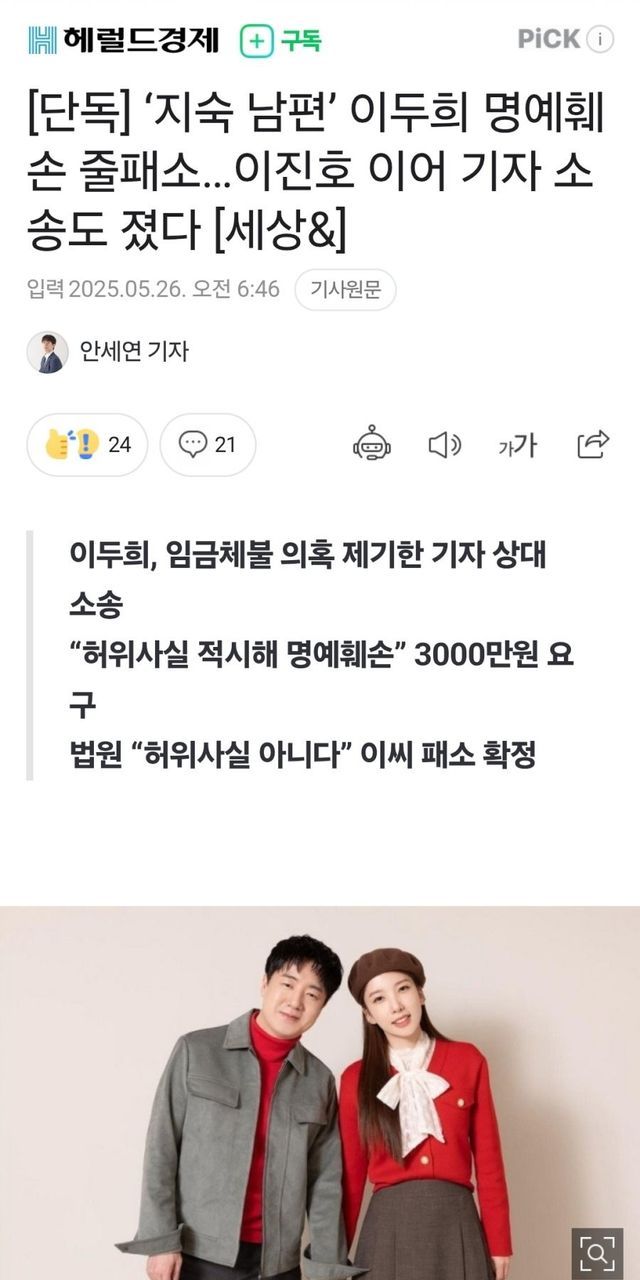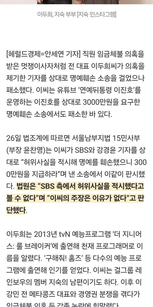 ‘지숙 남편’ 이두희 명예훼손 줄패소…