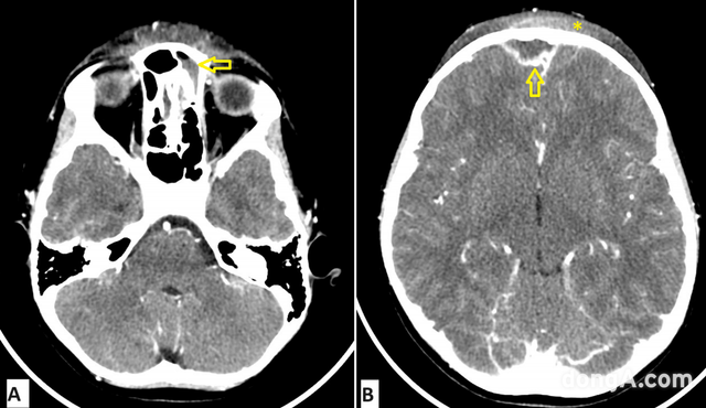 CT 검사 결과, 급성 전두동염(이마 부위 축농증)이 두개골과 그 주변으로 퍼졌다는 사실이 밝혀졌다.
