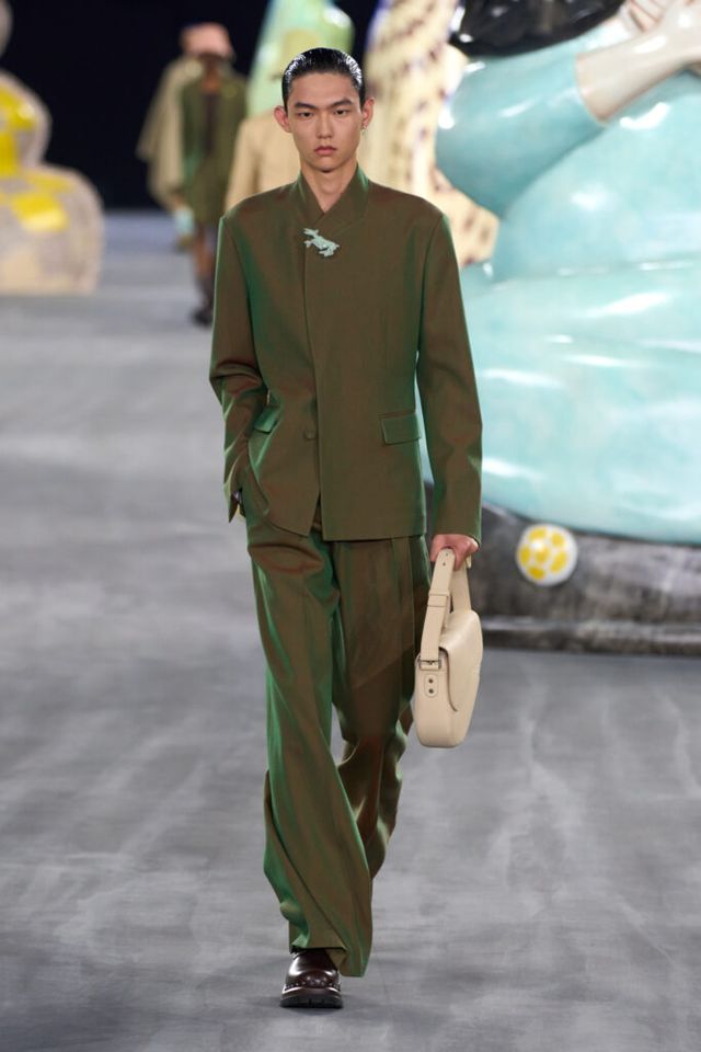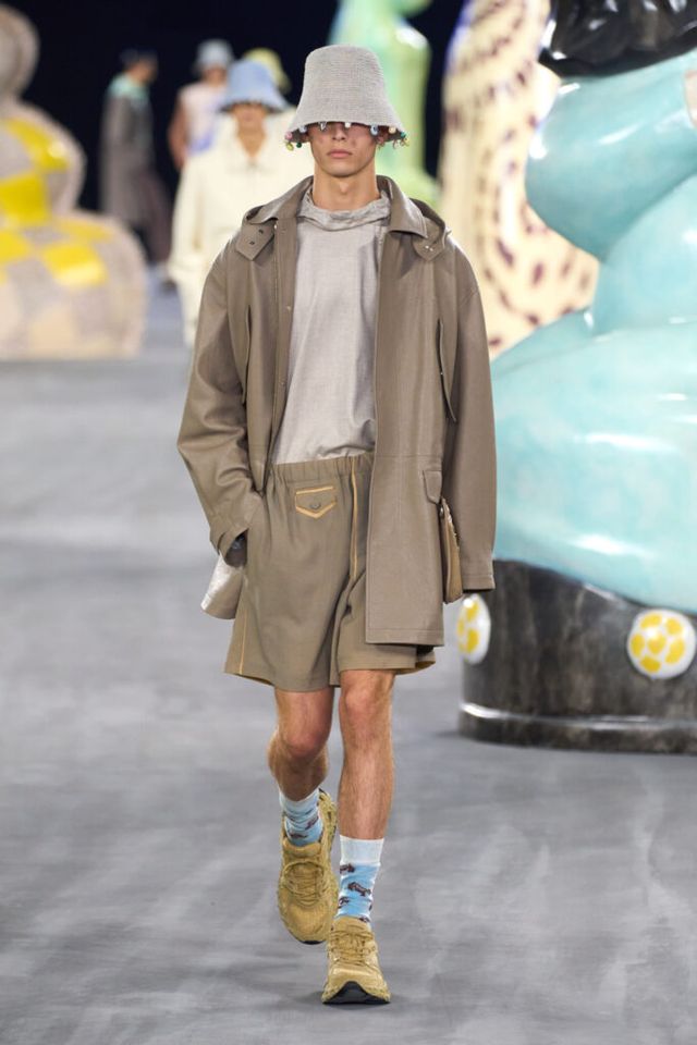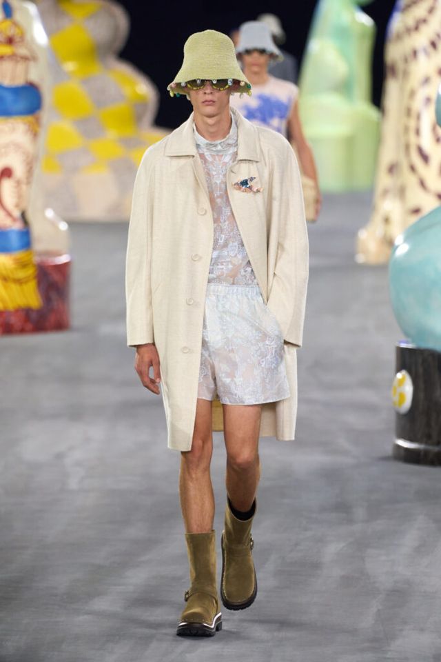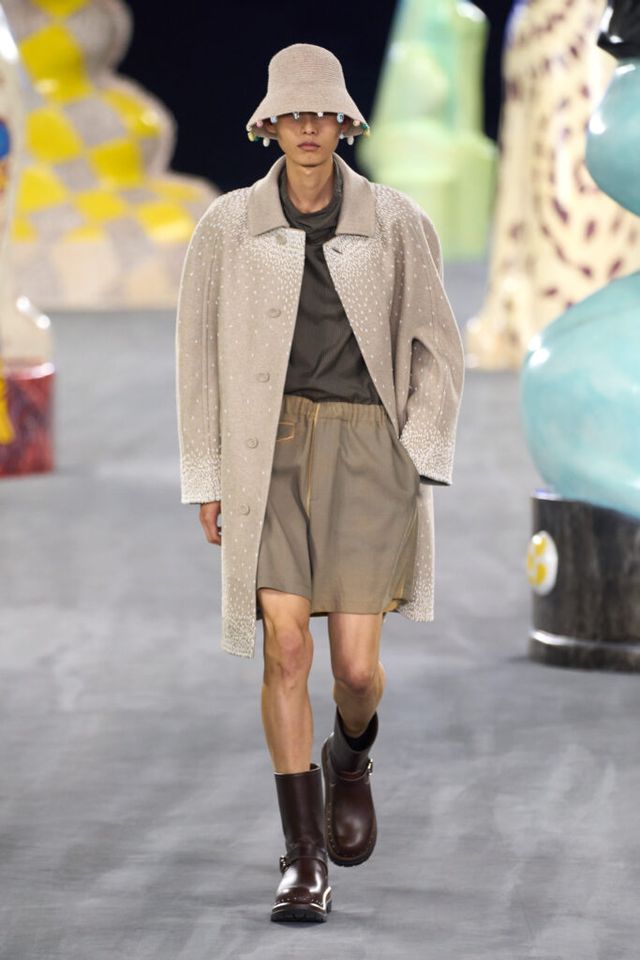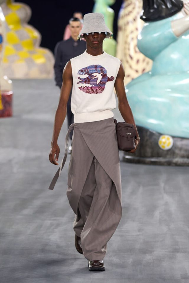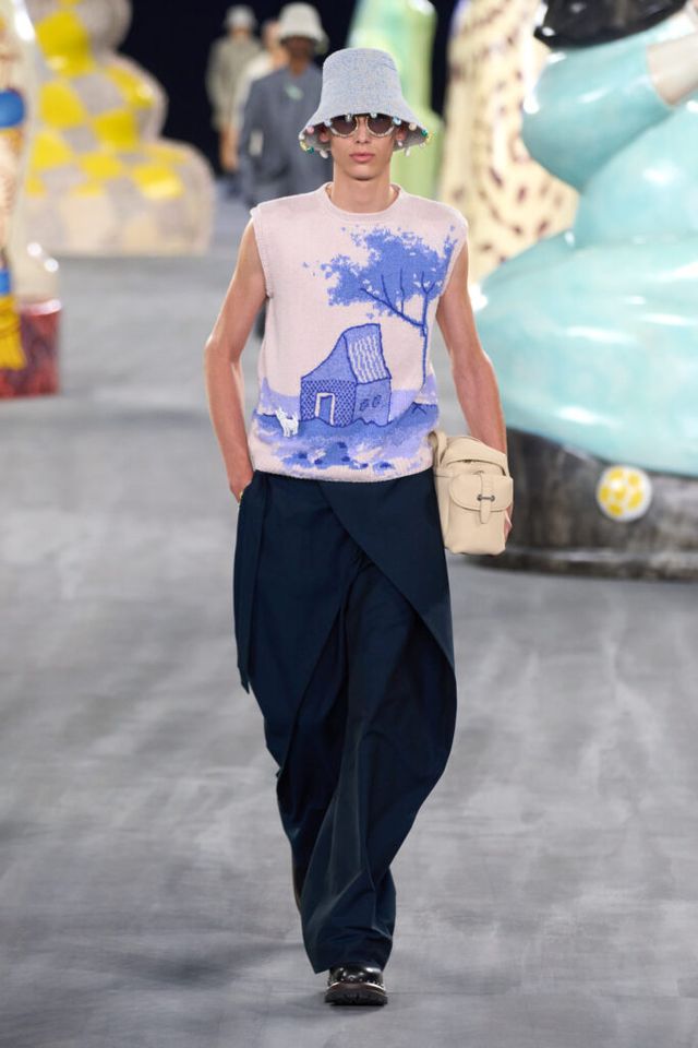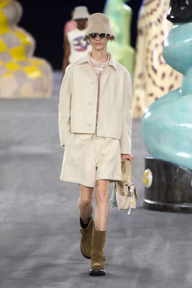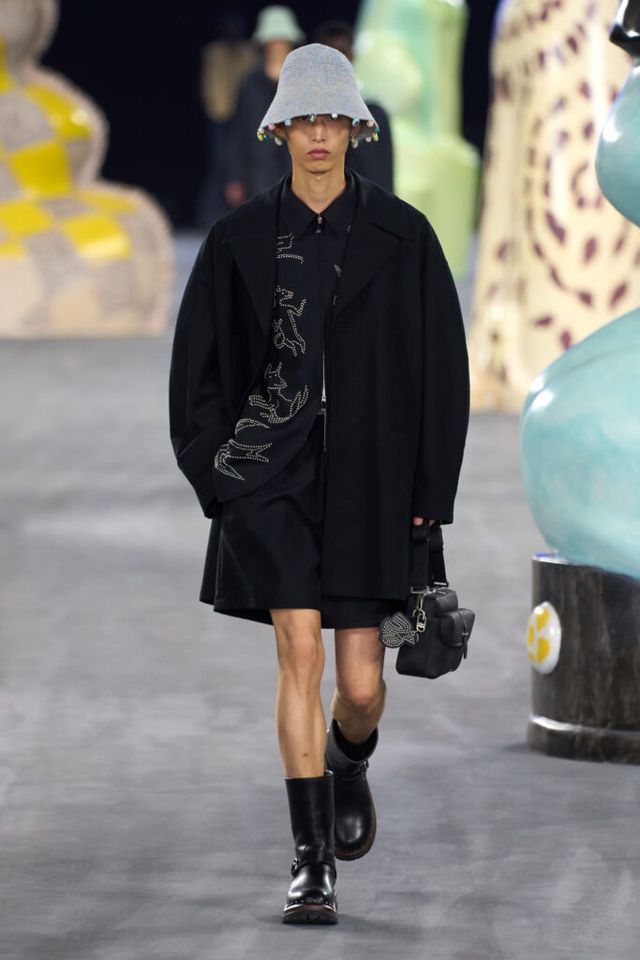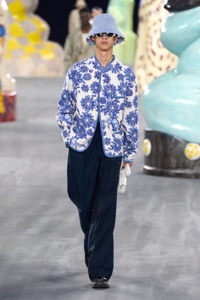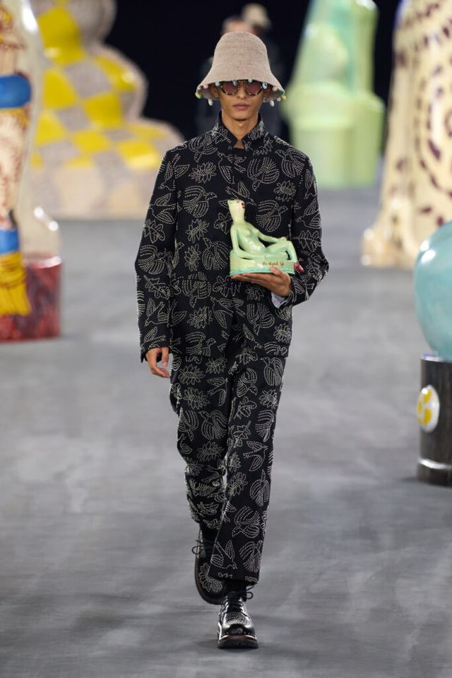 NOTE 세라믹 아티스트 힐턴 넬(Hylton Nel)의 작품과 삶에서 영감을 받아 디자인한 디올 맨 컬렉션은 장인정신에 대한 경의를 바탕으로 작가의 유산, 성취와 시간의 연속성에 찬사를 보낸다. 거대한 도자 작품 사이로 등장한 룩은 럭셔리와 실용성, 여성의 오트 쿠튀르 아카이브가 결합되며 디올의 유구한 히스토리와 지속 가능성을 이야기한다. 둥글고 풍성한 실루엣을 이룬 테일러링, 단단한 만듦새가 돋보이는 아우터 웨어 위로 힐턴 넬의 위트가 느껴지는 프린트와 세라믹 장식을 가미하고, 스테판 존스가 마법을 부린 도자기 비즈 장식 클로슈로 재미를 더했다.