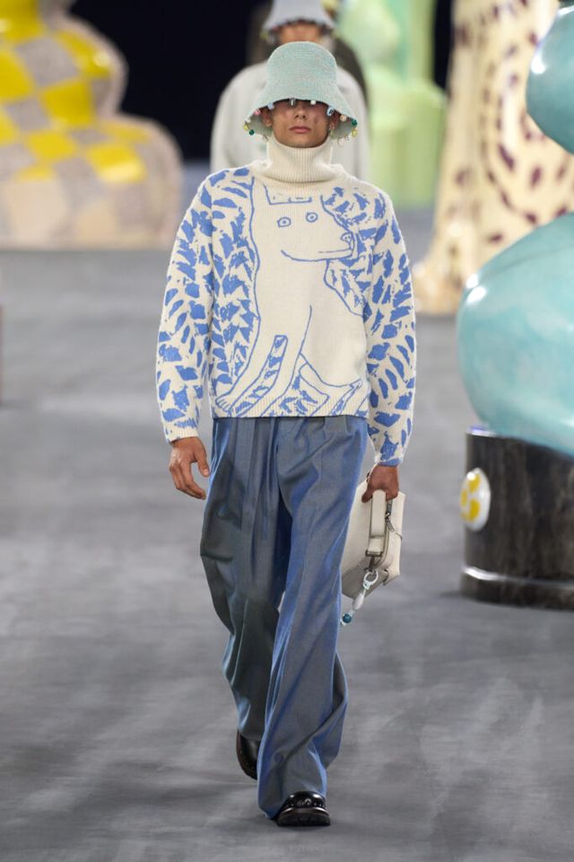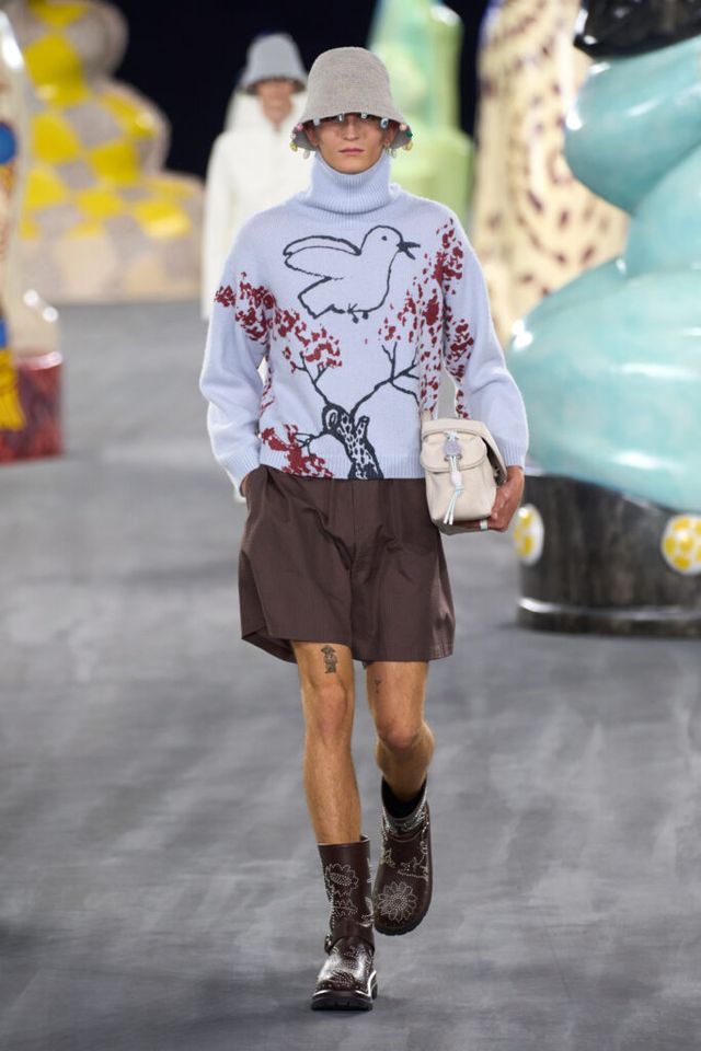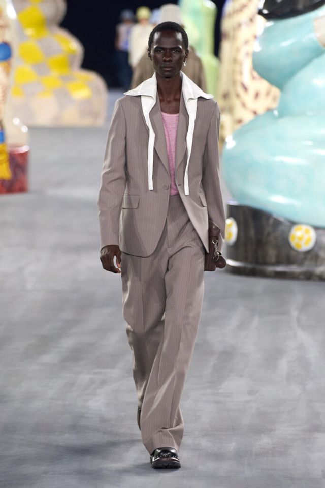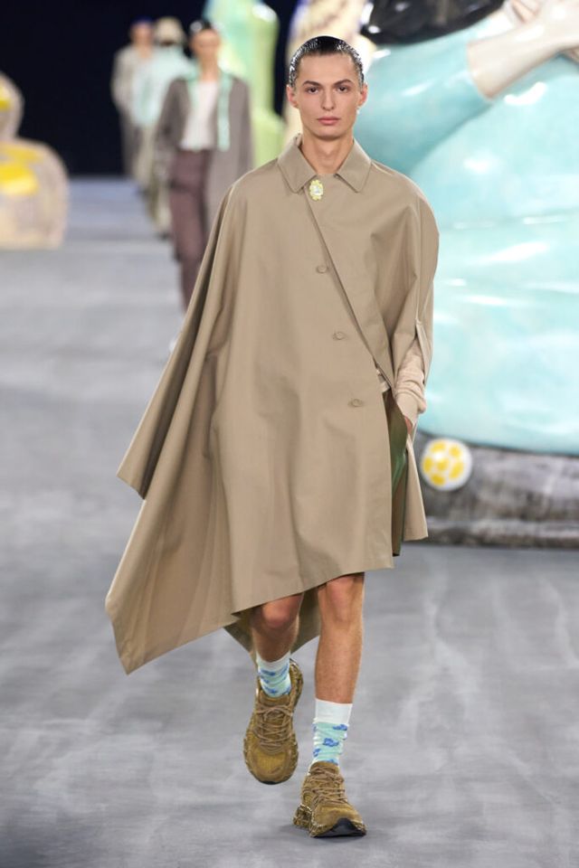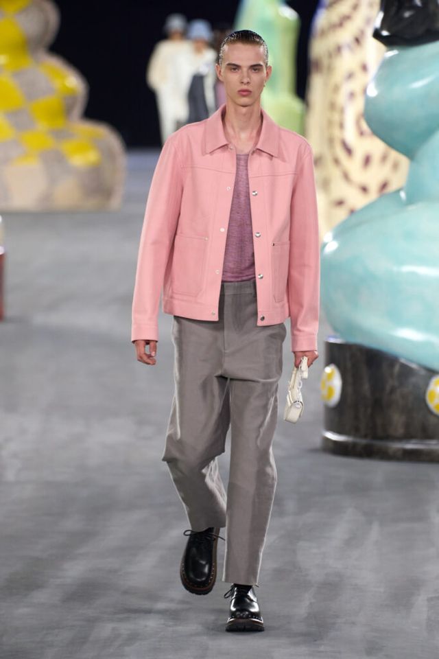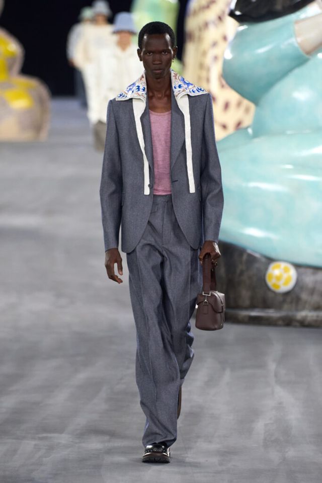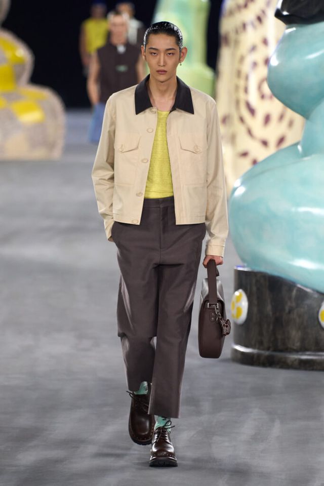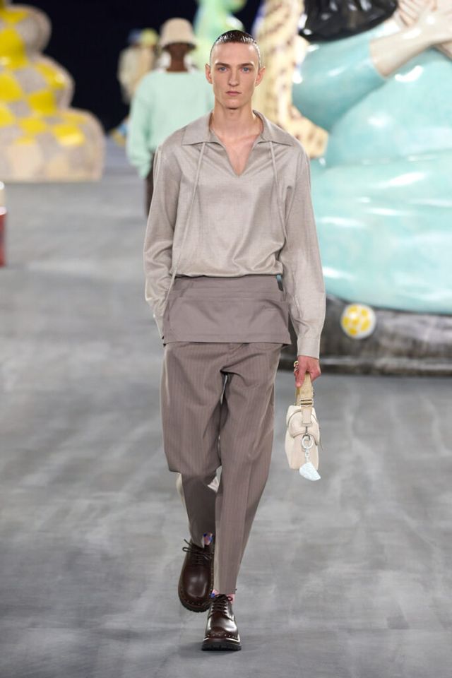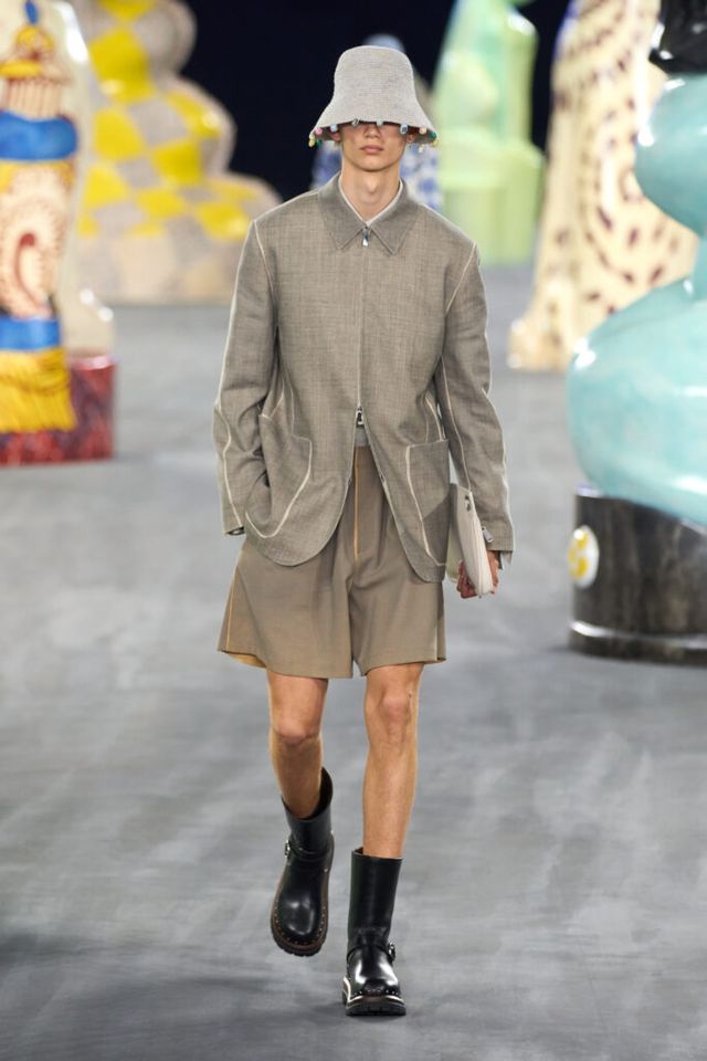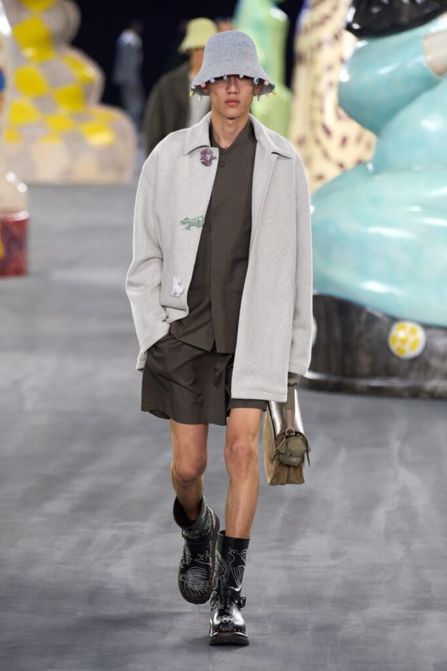 NOTE 세라믹 아티스트 힐턴 넬(Hylton Nel)의 작품과 삶에서 영감을 받아 디자인한 디올 맨 컬렉션은 장인정신에 대한 경의를 바탕으로 작가의 유산, 성취와 시간의 연속성에 찬사를 보낸다. 거대한 도자 작품 사이로 등장한 룩은 럭셔리와 실용성, 여성의 오트 쿠튀르 아카이브가 결합되며 디올의 유구한 히스토리와 지속 가능성을 이야기한다. 둥글고 풍성한 실루엣을 이룬 테일러링, 단단한 만듦새가 돋보이는 아우터 웨어 위로 힐턴 넬의 위트가 느껴지는 프린트와 세라믹 장식을 가미하고, 스테판 존스가 마법을 부린 도자기 비즈 장식 클로슈로 재미를 더했다.