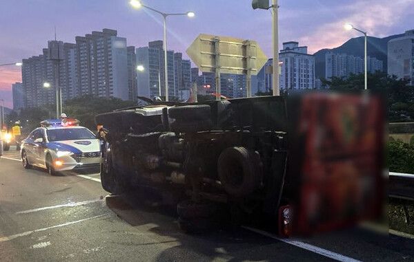 26일 오전 4시20분께 부산 동래구 번영로 원동IC 출구를 빠져나가던 1t 탑차가 가드레일을 들이받은 뒤 오른쪽으로 전도됐다.