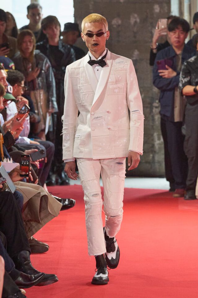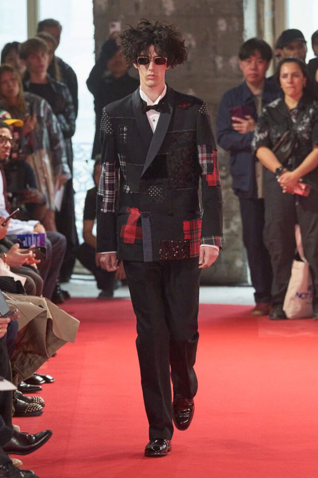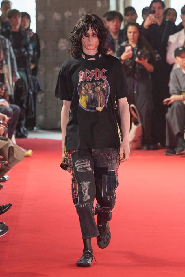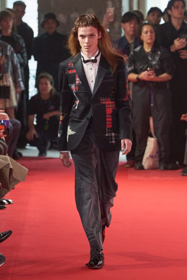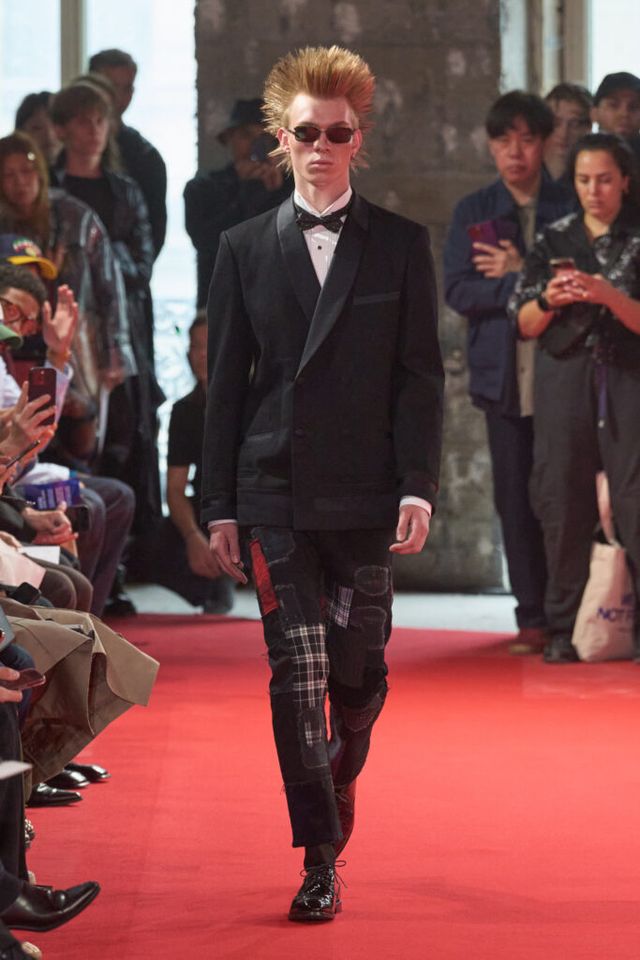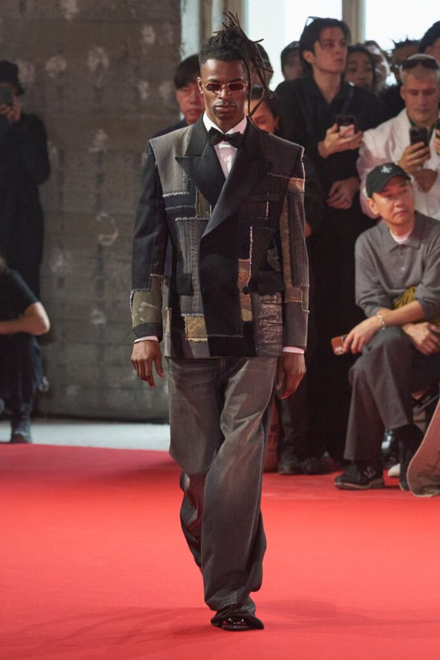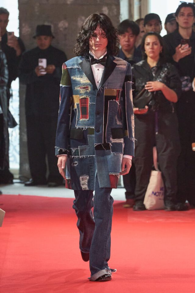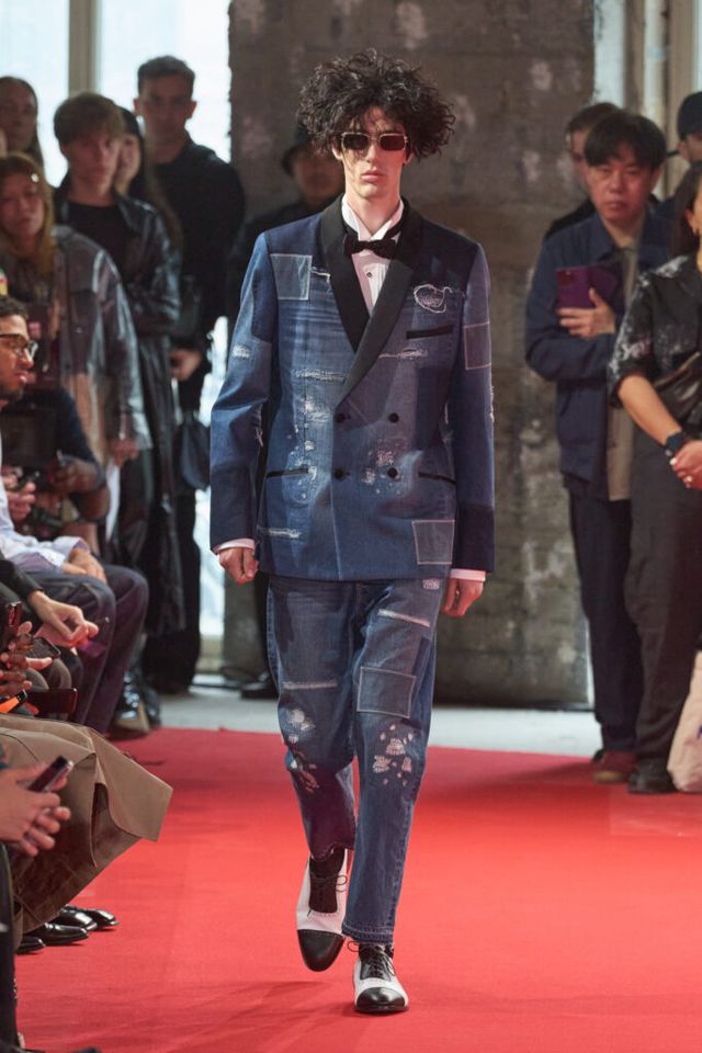 NOTE 자유분방한 음악과 문화, 성의 경계를 허무는 젠더리스로 대표되는 준야 와타나베의 미학은 이번 시즌에도 데님 패치워크 기법을 중심으로 1990년대 글램록 감성을 현대적으로 재해석했다. 블랙, 블루, 화이트 데님 소재로 턱시도 스타일을 정교한 실루엣으로 구현해냈고, 스팽글과 가죽, 자수 등 다채로운 소재와 기법의 조합은 펑키하면서도 우아한 룩으로 탄생했다. 그런가 하면 모델들의 헤어스타일과 플레어 팬츠, 투톤 슈즈와 빈티지한 록 밴드 티셔츠 등은 1980년대 글램록의 에너지를 소환하며 관객을 또다시 사로잡았다.