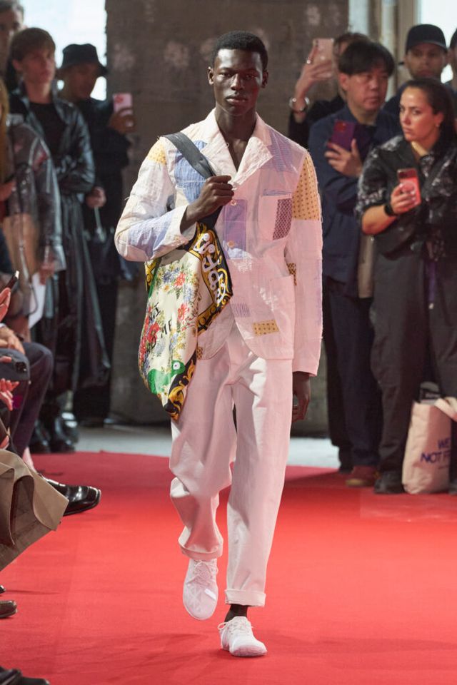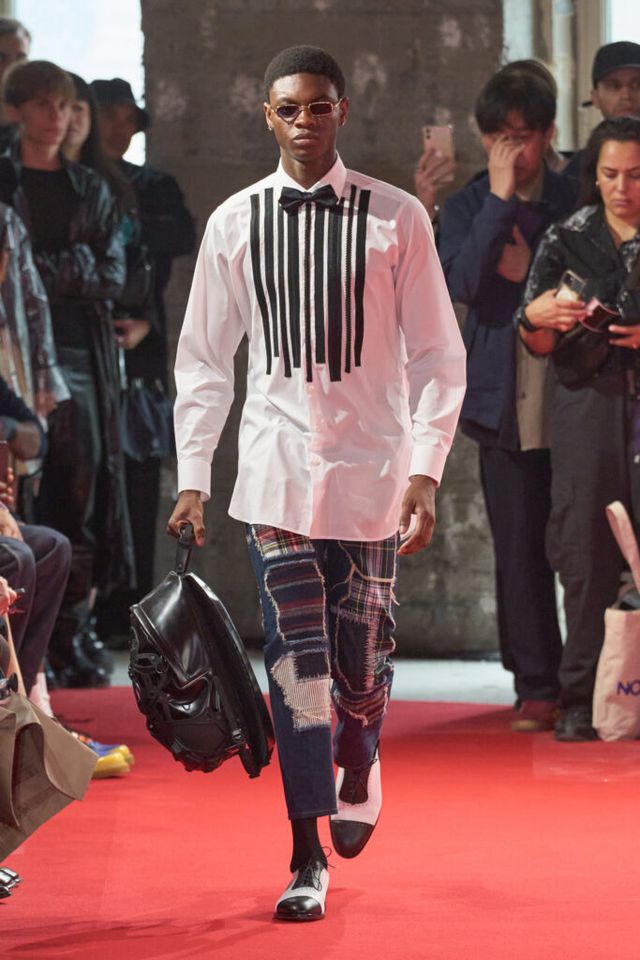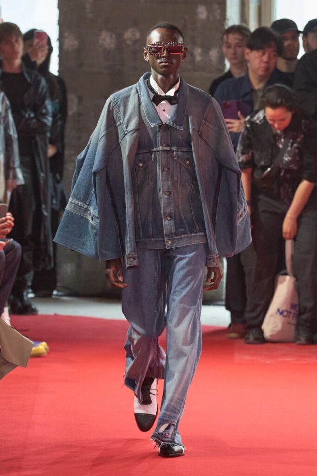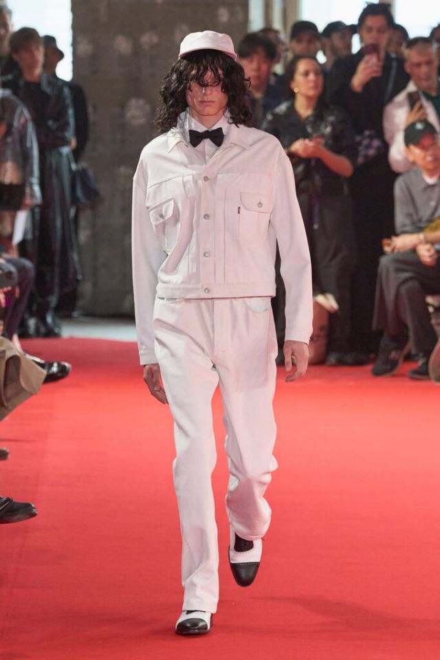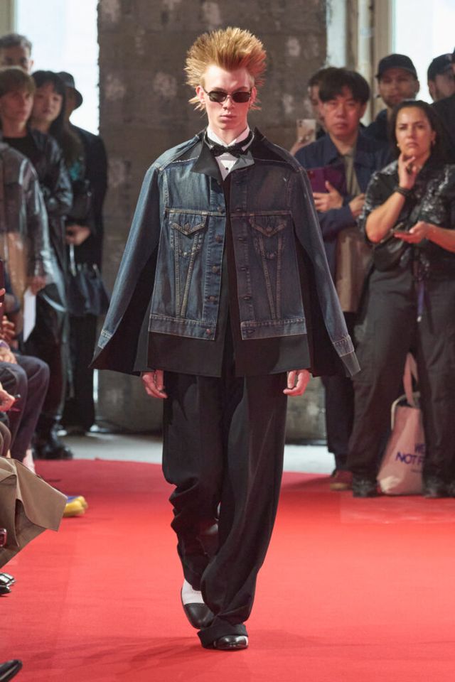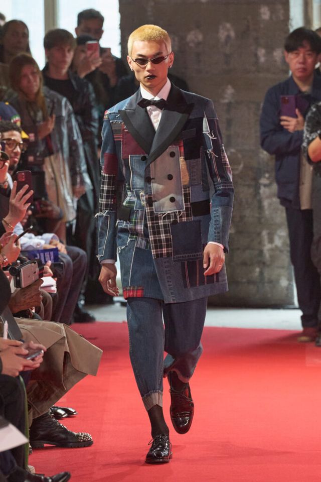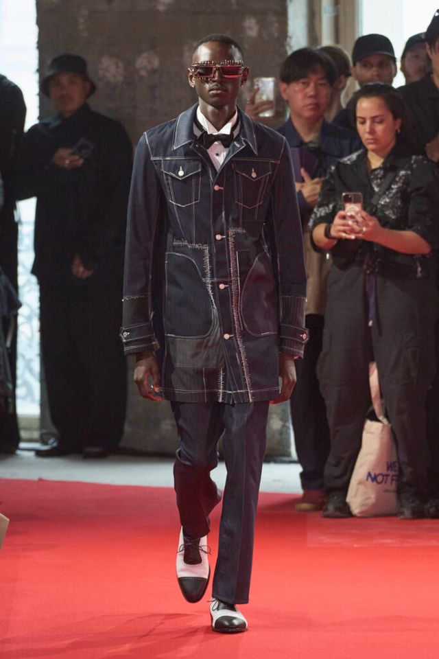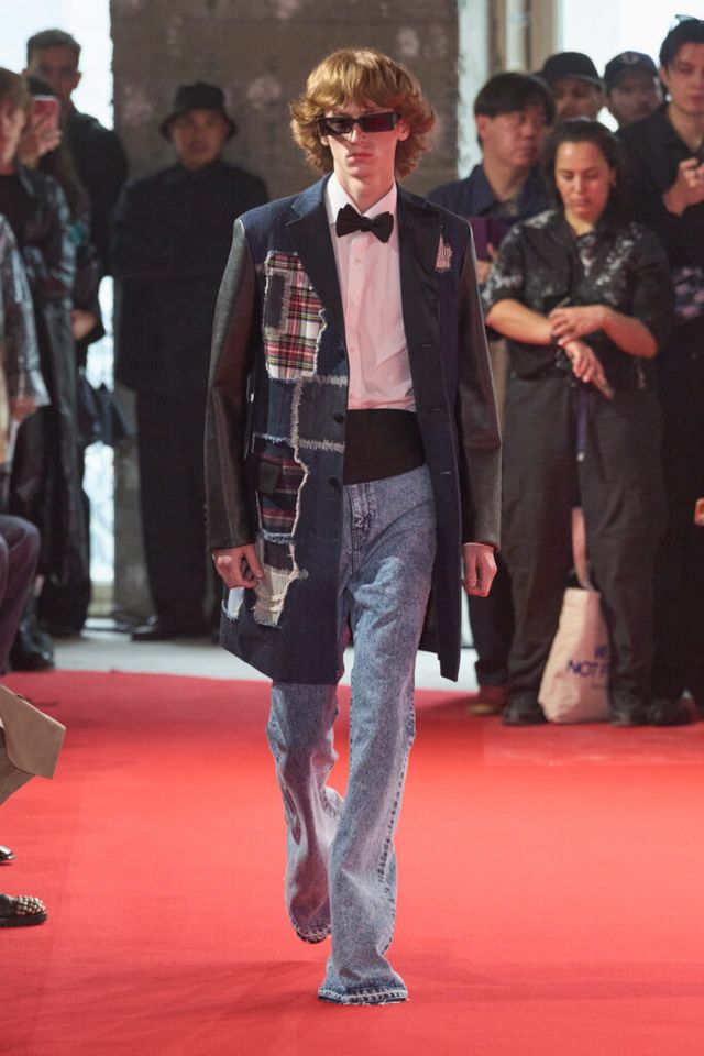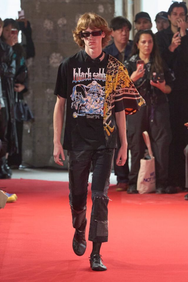 NOTE 자유분방한 음악과 문화, 성의 경계를 허무는 젠더리스로 대표되는 준야 와타나베의 미학은 이번 시즌에도 데님 패치워크 기법을 중심으로 1990년대 글램록 감성을 현대적으로 재해석했다. 블랙, 블루, 화이트 데님 소재로 턱시도 스타일을 정교한 실루엣으로 구현해냈고, 스팽글과 가죽, 자수 등 다채로운 소재와 기법의 조합은 펑키하면서도 우아한 룩으로 탄생했다. 그런가 하면 모델들의 헤어스타일과 플레어 팬츠, 투톤 슈즈와 빈티지한 록 밴드 티셔츠 등은 1980년대 글램록의 에너지를 소환하며 관객을 또다시 사로잡았다.