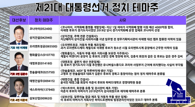 대선 후보 여론조사에서 선두를 달리고 있는 이재명 후보와 관련된 정치 테마주는 △코나아이(052400) △상지건설(042940) △오리엔트정공 등이 꼽힌다.