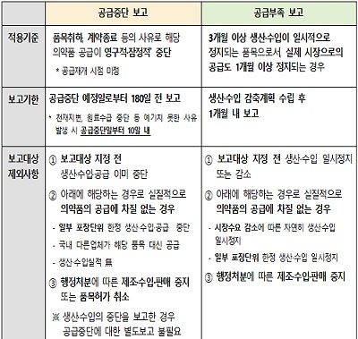 이번 개정안은 3개월 이상 생산·수입이 일시적으로 정지되어 실제 시장으로의 공급이 1개월 이상 정지되는 품목에 대해 공급부족 의무보고를 하도록 기준을 신설하고, 이를 계획이 수립된 날로부터 1개월 내 보고하도록 했다.