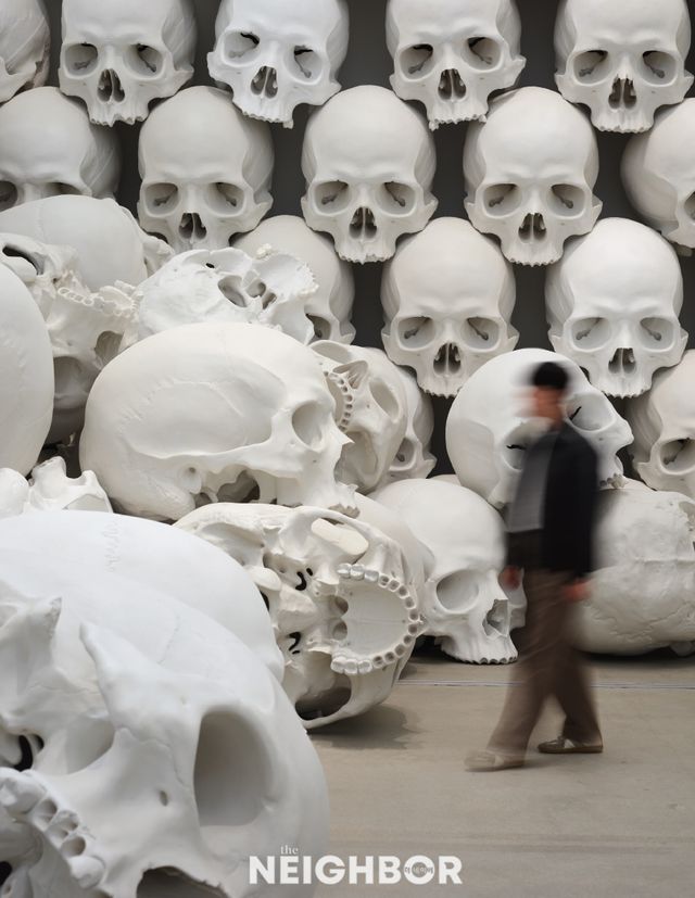 기자간담회에서 찰리 클라크는 “론 뮤익이 실제 크기보다 크거나 작게 작업하는 이유는 실제 현실과 혼동하지 않으면서 실제가 아닌 듯한 감상을 불러일으키기 위해서”라고 언급했다. 많은 관람객과 거대한 두개골에 둘러싸인 채 천장 높은 곳에 난 창을 바라보는 순간을 상상해보라. 비현실적인 장면 속에서 우리의 사유는 일상을 벗어나 삶과 죽음 사이로 흐른다.