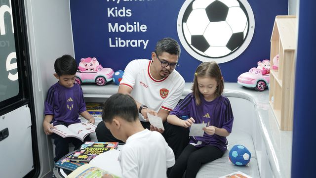 '찾아가는 도서관'에서 아이들과 시간을 보내는 밤방 파뭉카스 전 인도네시아 축구 국가대표 선수. / 현대자동차