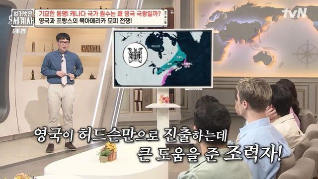 은지원은 “영국이 먼저 왔는데 왜 프랑스가 정착 하게 둔거냐”라고 물었고, 윤 교수는 “영국은 퀘벡이 너무 추워서 정착을 고민을 하고 있었다. 이때 영국은 남부 버지니아에 첫 정착존을 세웠다”라고 전했다.
