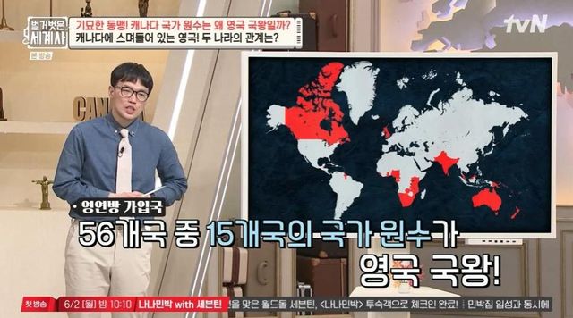 이를 보던 규현은 “이런 영국과 캐나다의 관계를 전혀 몰랐다”라며 놀랐고, 은지원은 “너무 충격적이다. 너무 영국 바라기 아니냐”라며 혀를 내둘렀다.