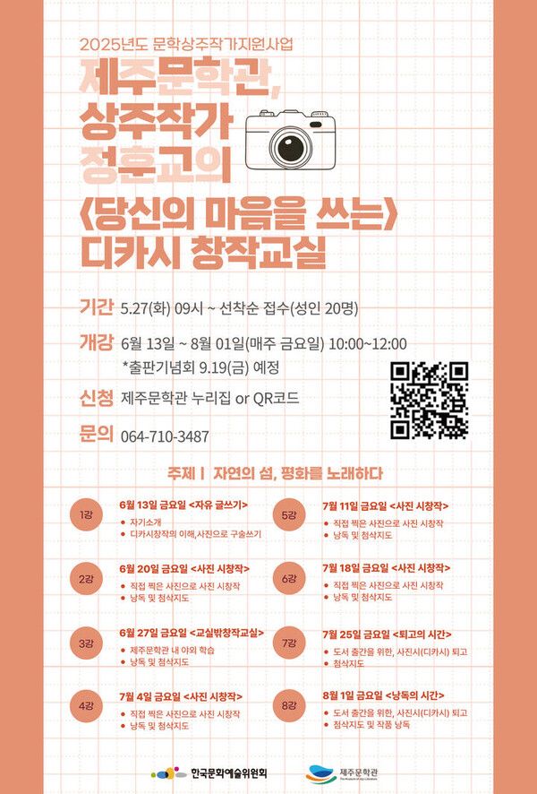 강의는 6월13일부터 8월1일까지 매주 금요일 오전 10시에 제주문학관 3층 세미나실에서 진행한다.