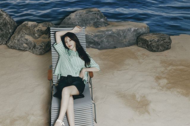 또한 여름에 제격인 에메랄드 컬러에 짧은 기장감의 셔츠와 데님 쇼츠를 매치한 캐주얼하고 편안한 바캉스룩도 보여줬다. 산뜻한 컬러에 플라워 모티브 자수로 포인트를 준 스트라이프 셔츠와 배색 스티치가 가미된 A라인 데님 쇼츠는 바캉스는 물론 일상에서도 활용도가 높다.