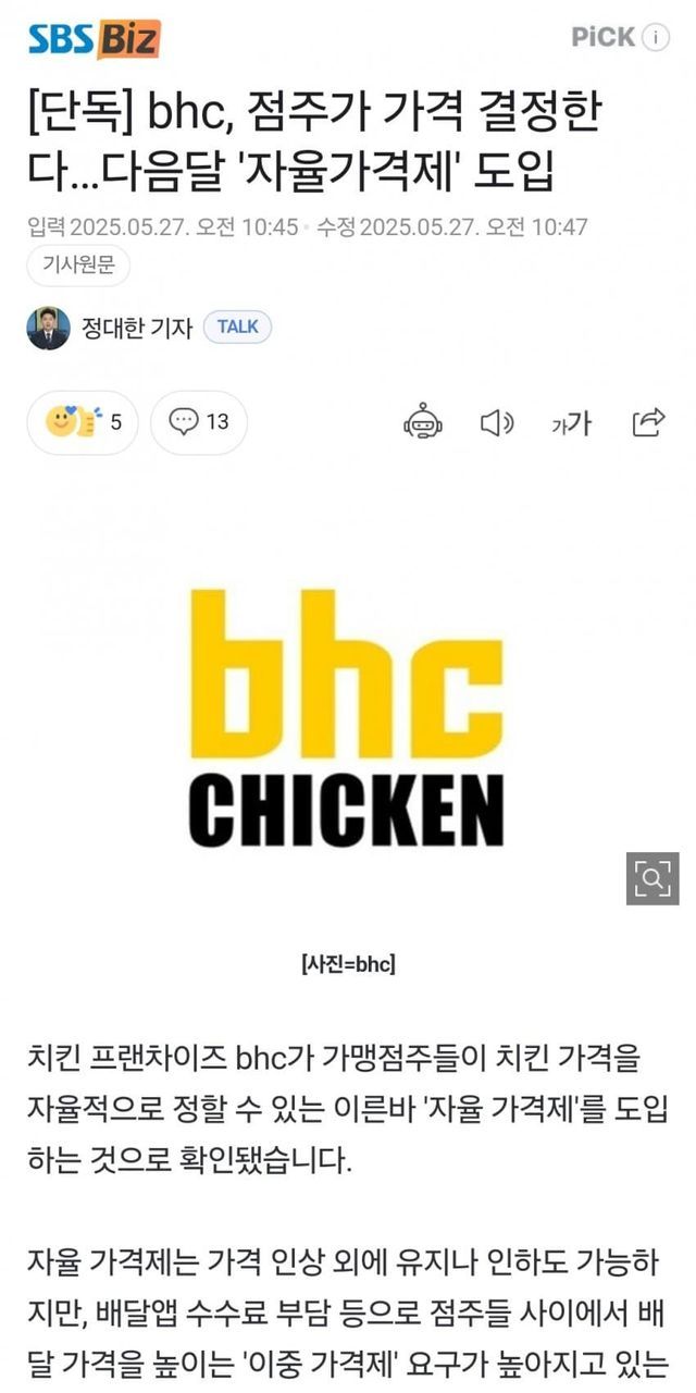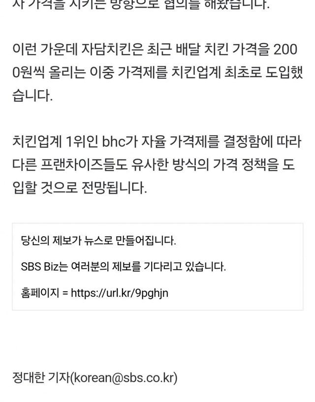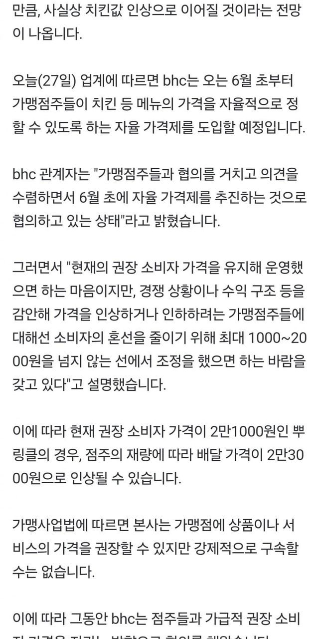 점주가 치킨 가격 정하게 할 예정