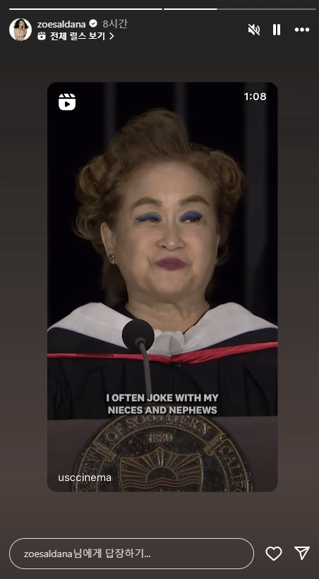 할리우드 배우 조 샐다나는 27일 자신의 SNS에 미국 서던캘리포니아대학교 영화예술대학(USC School of Cinematic Arts, 이하 SCA) 공식 채널에 올라온 게시물을 리그램했다.