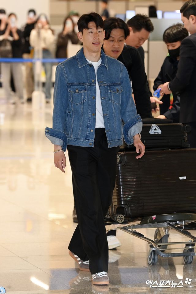 이날 손흥민은 데님 재킷에 루즈한 블랙 팬츠, 화이트 티셔츠를 매치한 심플하면서도 센스 있는 룩을 선보였다. 청청 패션을 연상시키는 클래식한 데님 셋업은 손흥민 특유의 밝은 미소와 만나 더욱 세련된 무드를 완성했다.