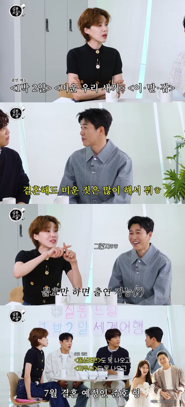장도연은 김종민의 '미운 우리 새끼' 하차에 관해 "얘기가 많던데"라고 너스레를 떨었고, 차태현은 "결혼했는데 미우새를 왜 나가"라고 말했다.