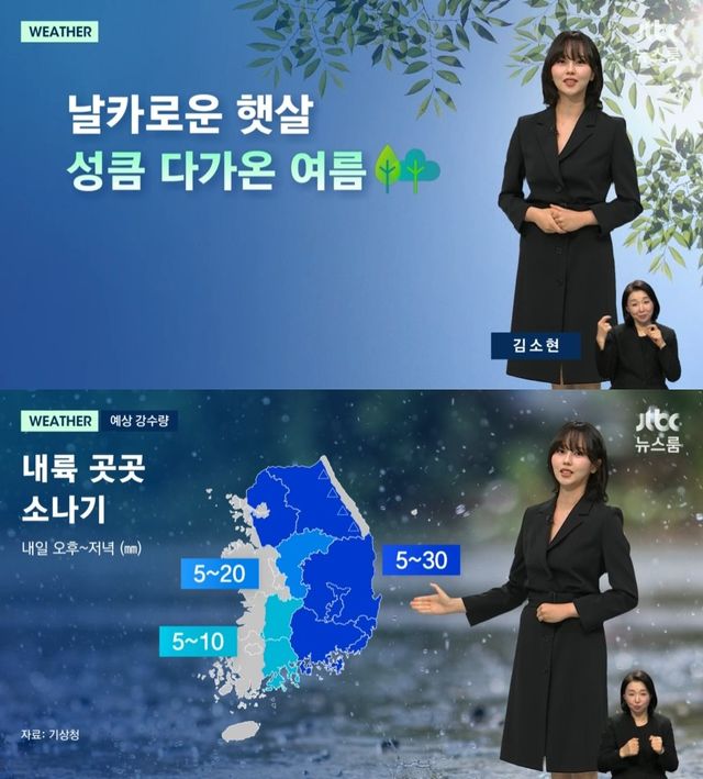 김소현은 "내일도 초여름 더위가 이어지겠다. 서울 낮 기온이 26도까지 오르면서 낮에는 다소 덥겠다. 그래도 아침저녁으로는 15도 선에 머물며 일교차가 크게 벌어진다"고 차분히 날씨를 전했다.