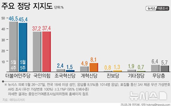 뉴시스 보도에 따르면, 더불어민주당 지지율이 45.4%, 국민의힘 지지율이 37.4%라는 여론조사 결과가 28일 나왔다.