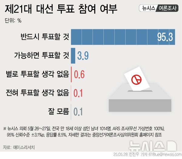 제21대 대통령 선거에서 '반드시 투표하겠다'는 유권자 비율이 95%를 넘겼다는 여론조사 결과가 28일 나왔다.