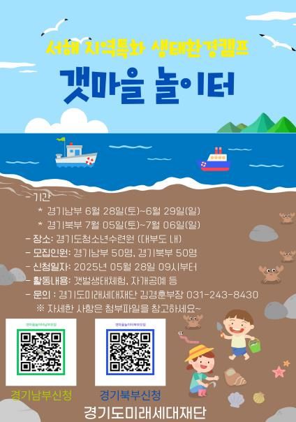 [파이낸셜경제=김영란 기자] 경기도미래세대재단은 28일부터 서해 지역특화 생태환경 캠프 ‘갯마을 놀이터’ 참가자를 선착순 모집한다.