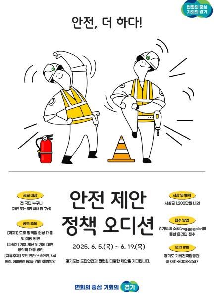 [파이낸셜경제=김영란 기자] 경기도가 6월 5일부터 19일까지 전국민을 대상으로 ‘안전제안 정책오디션 2025’ 공모전을 진행한다.