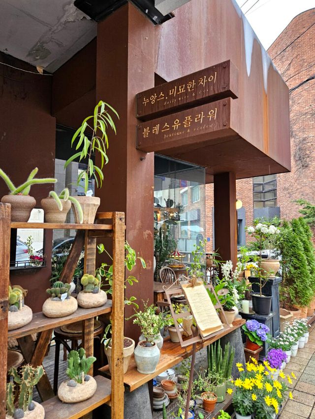 겉보기엔 카페인지 플라워숍인지 구분하기에 애매하지만, 정답은 둘 다. 정확히 말하자면, 플로리스트 최민지가 운영하는 와인 바 ‘누앙스’와 플라워숍 ‘블레스유플라워’가 하나의 세계처럼 묶여 있는 복합 공간이다. 블레스유플라워에서는 플라워 레슨까지 진행하고 있어 언제나 분주한 것이 특징. 꽃과 식물에 관심이 많은 사람부터 한 템포 쉬어 가려고 방문하는 이들까지 이곳의 방문객은 다양하다.