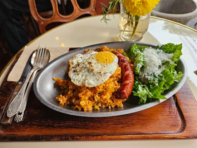 누앙스는 와인과 뱅쇼, 커피, 디저트, 식사 메뉴까지 갖춘 카페 겸 와인바이기도 하다. 특히 추천하고 싶은 메뉴는 큼지막한 소시지가 함께 나오는 김치볶음밥. 익숙한 맛이지만 재료의 조화가 인상 깊다. 식사 후에는 달달한 밀크티와 아포카토로 여운을 즐겨보길. 가격대가 있는 편이지만, ‘이번 달에도 수고한 나’를 위한 보상이라면 충분히 의미 있다.