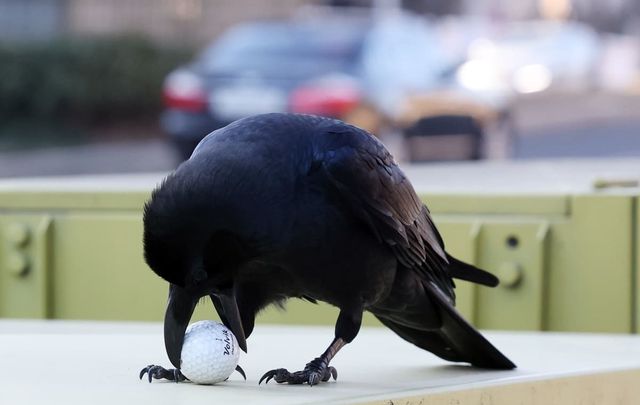 골프공을 입에 물고 있는 까마귀 / 뉴스1