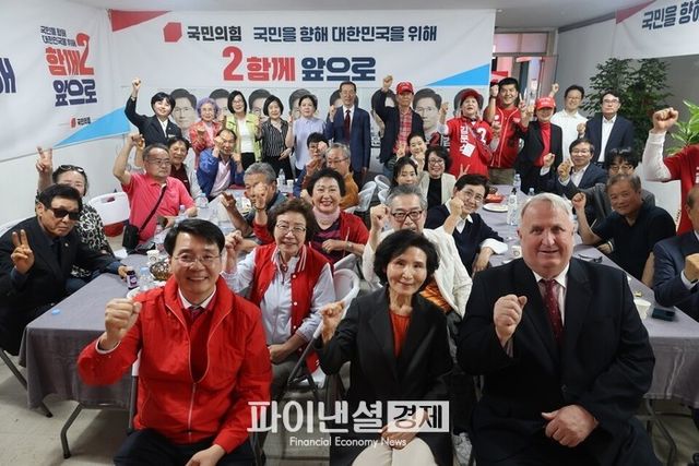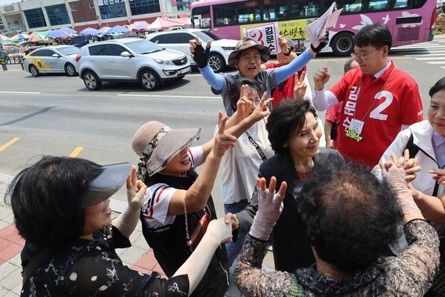 | ▲ 김문수 대선 후보 부인 설난영 여사가 27일 전라남도 순천에서 열린 순천시 선대위 회의에 참석해 기념촬영을 하고 있다./사진=국민의힘 제공 |