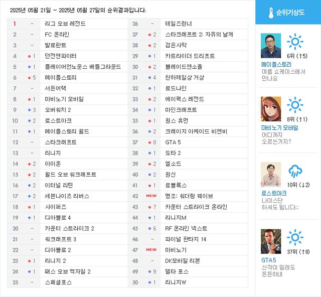하위권에서는 GTA 5가 지난주보다 8계단 상승한 37위에 자리했다. 주요 지표 중 눈에 띄게 상승한 부분은 개인방송 시청자 수다. 영상 플랫폼 중 치지직에서 반응도가 높았는데, 지난 25일부터 게임 스트리머인 콩콩 주최로, 여러 방송인이 참여한 GTA 온라인 방송인 서버 ‘콩밥특별시’가 열리며, 관련 방송과 시청자 수가 증가했다. GTA 5는 트위치에서 10년 이상 가장 많이 시청된 게임 1위를 차지했는데, 국내에도 방송인 서버 활동이 활발해지며 관심도가 상승한 것으로 보인다.