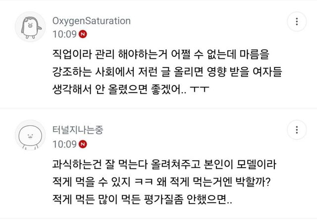 지들도 적게 먹고 살 빼든가 왜 직업이 모델인 사람한테 지랄옆차기인지...