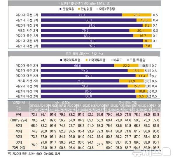 연령대별 적극적 투표 참여 응답자를 보면 18~29세 이하 77.0%, 30대 81.5%, 40대 90.0%, 50대 89.3%, 60대 90.1%, 70대 이상 91.2%다. 이는 30대를 제외한 모든 연령층에서 1차 조사 때보다 증가한 것이라고 중앙선관위는 설명했다.