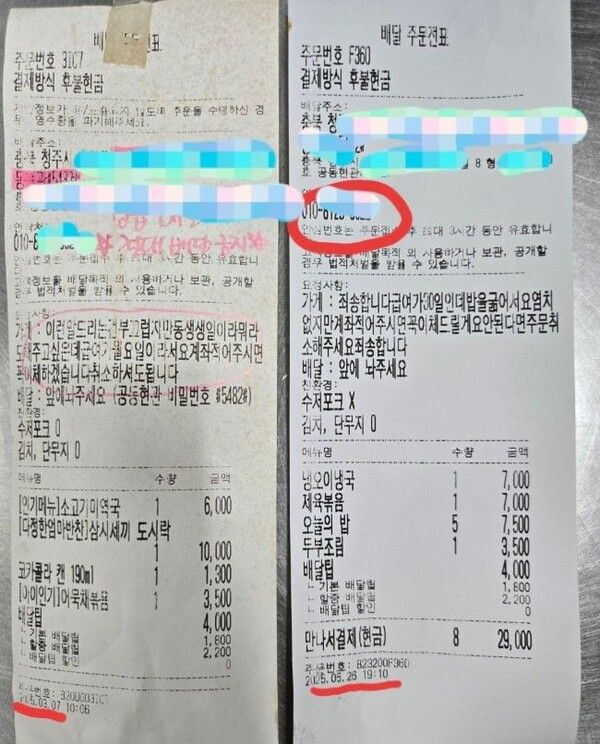 그는 "왼쪽 영수증에 보이는 그대로의 내용으로 주문이 들어왔다. 그때 당시 배달업계에 먹튀 상습범들이 생기고 있다는 글을 종종 카페에서 보곤 해서, 주문을 일단 수락했지만 머릿속에 많은 생각이 들었다"며 '과연 이 손님도 그런 분일까' 생각했다"고 말했다.
