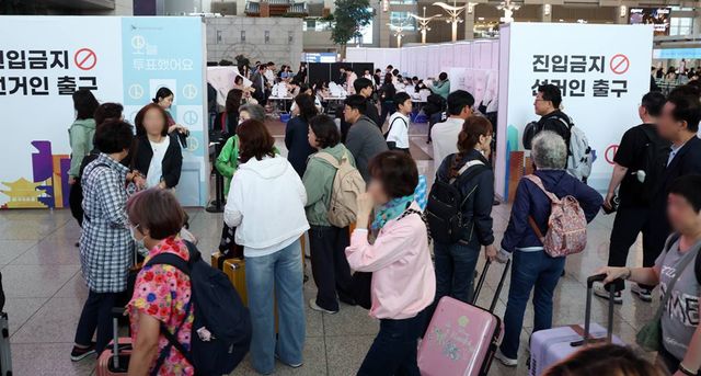 제21대 대통령선거 사전투표일인 29일 오전 인천공항에서 여행객들이 출국 전 투표를 하고 있다 / 뉴스1