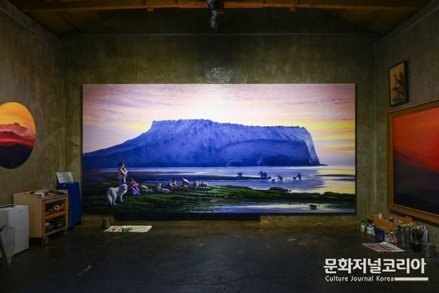 웅장한 성산일출봉을 배경으로, 제주의 어머니인 해녀들의 삶과 노동을 깊이 있게 담아낸 이번 대작은, 삶과 자연, 그리고 기억의 본질을 섬세한 붓질로 끌어올린다. 작가는 이 작업을 통해 제주 바다에 스며든 어머니의 강인함과 따뜻함을 시각적으로 형상화 하고 있다.