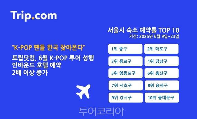 트립닷컴이 ‘제34회 서울가요대상’, ‘2025 부산원아시아페스티벌’ 등 주요 K-POP 이벤트가 몰린 6월 인바운드 여행 데이터를 분석한 결과, 6월 9일부터 23일까지 2주간 한국 내 호텔 예약 건수는 전년 동기 대비 2배(133%) 이상 증가한 것으로 나타났다.