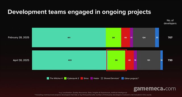 ▲ CDPR 개발자 현황, 사이버펑크 2는 4월 30일 기준 96명이 투입됐다 (사진출처: CDPR IR 자료)