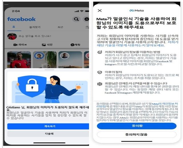 메타 '얼굴인식' 기술 사용 동의 및 동의 철회 화면 예시 ⓒ 개인정보보호위원회