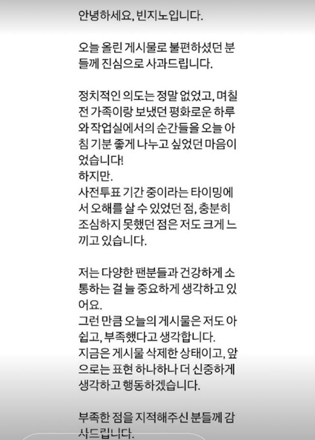 빈지노는 29일 오후 자신의 SNS에 “오늘 올린 게시물로 불편하셨던 분들께 진심으로 사과드립니다”라며 “정치적인 의도는 정말 없었고, 며칠 전 가족이랑 보냈던 평화로운 하루와 작업실에서의 순간들을 오늘 아침 기분 좋게 나누고 싶었던 마음이었습니다”라고 말했다.