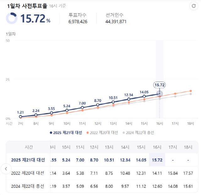 지난 20대 대선 사전투표율은 첫날 오후 4시 기준 14.11%였고, 지난해 22대 총선 당시에는 12.60%였다.