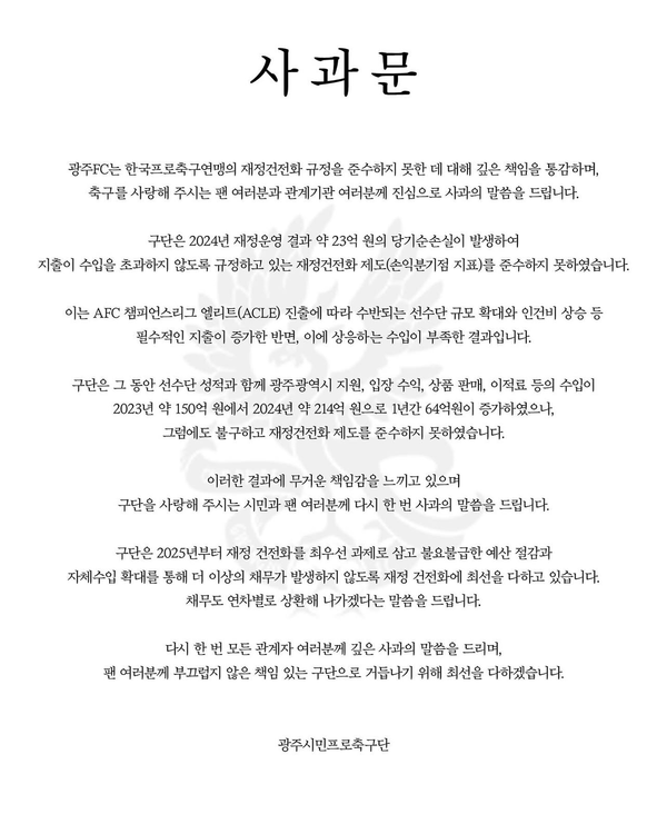 [풋볼리스트] 김희준 기자= 광주FC가 8일 만에 또 다른 사과문을 게재했다. 29일 공식 소셜미디어(SNS)를 통해 “광주는 한국프로축구연맹의 재정건전화 규정을 준수하지 못한 데 대해 깊은 책임을 통감하며, 축구를 사랑해주시는 팬 여러분과 관계기관 여러분께 진심으로 사과의 말씀을 드린다”라고 전했다.