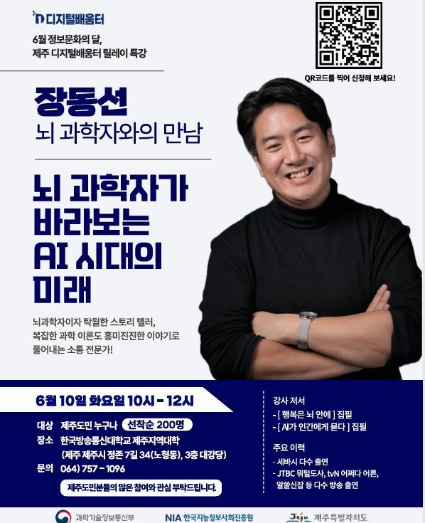 제주도는 디지털배움터 사업의 일환으로 6월 정보문화의 달을 맞아 뇌과학자 장동선 박사 초청 특강을 개최한다고 29일 밝혔다.
