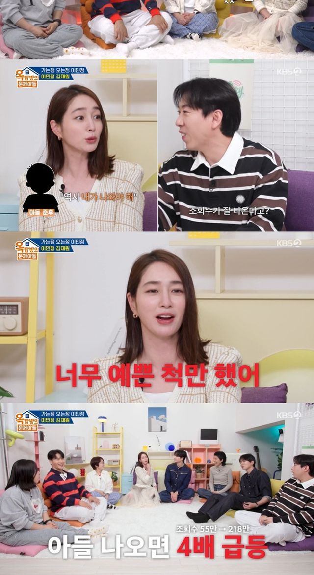 준후는 이민정의 유튜브 모니터까지 한다고. 이민정은 '역시 내가 나와야 조회수가 잘 나온다. 엄마 웨딩 드레스 편 너무 예쁜 척만 했다'는 아들의 말에 자존심이 상했지만 "진짜 준후가 나온 거랑(조회수가) 4배 차이다"라며 씁쓸한 마음을 드러냈다.