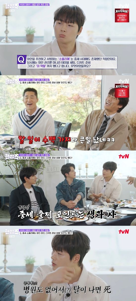 이날 이이경은 계산서를 확인했고, "낮에 먹은 거 중에 제일 많이 나왔다. 31만 1천 원이다"라며 전했다. 제작진은 밥값 내기를 위해 "스테이크나 파스타를 먹을 때 와인 많이 드시지 않냐. 와인을 추천하고 서빙하는 소믈리에는 중세 시대에도 있었다. 중세 시대에는 이 사람들이 와인 관리뿐만 아니라 테이블 세팅 디저트 준비 그리고 이것까지 했다고 한다. 무엇이었을까"라며 퀴즈를 냈다.
