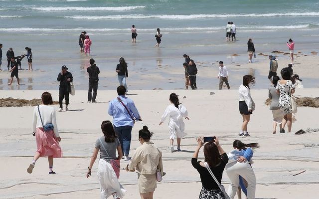 제주시 조천읍 함덕해수욕장에서 관광객들이 초여름 정취를 즐기고 있다. / 뉴스1